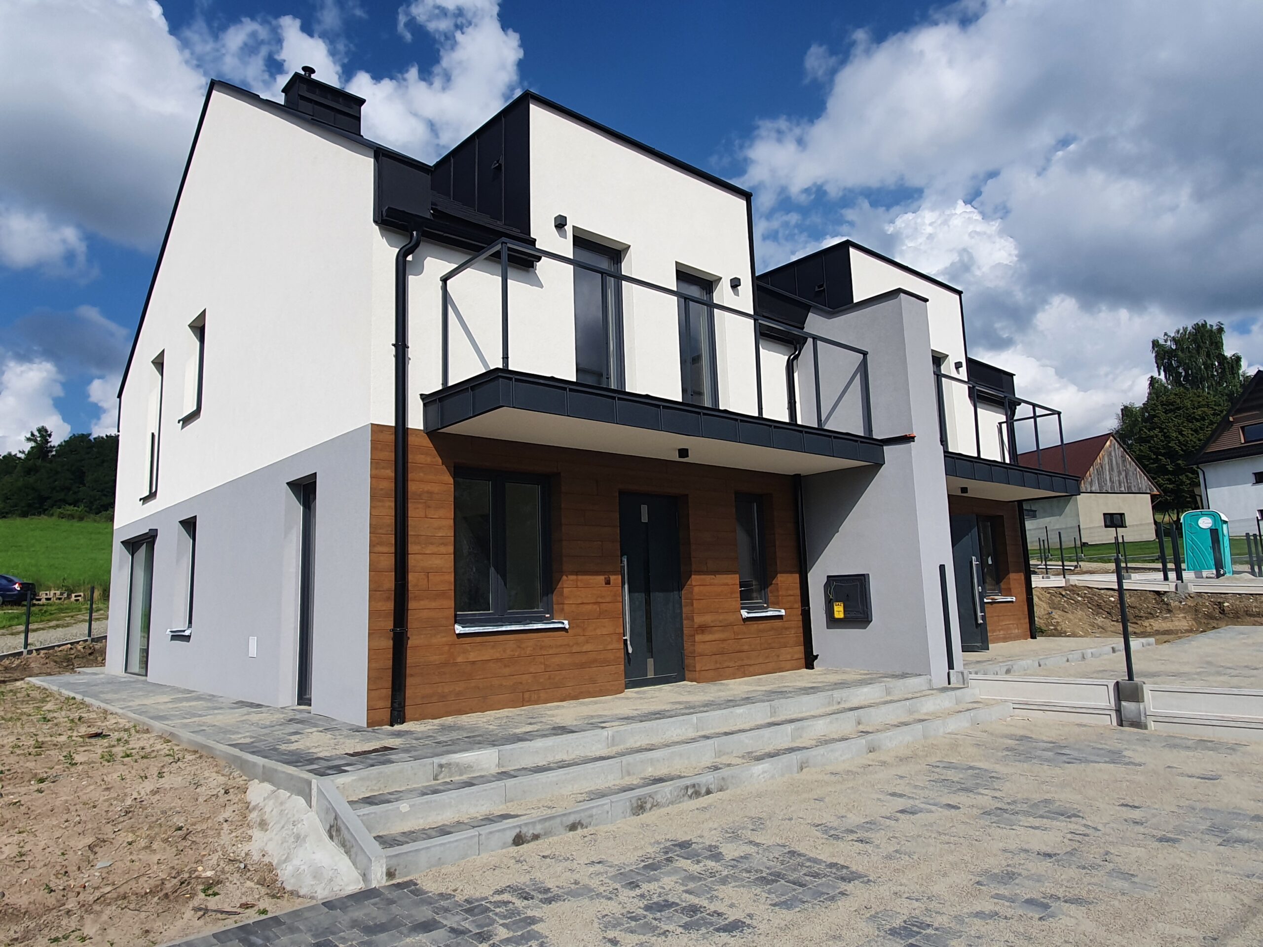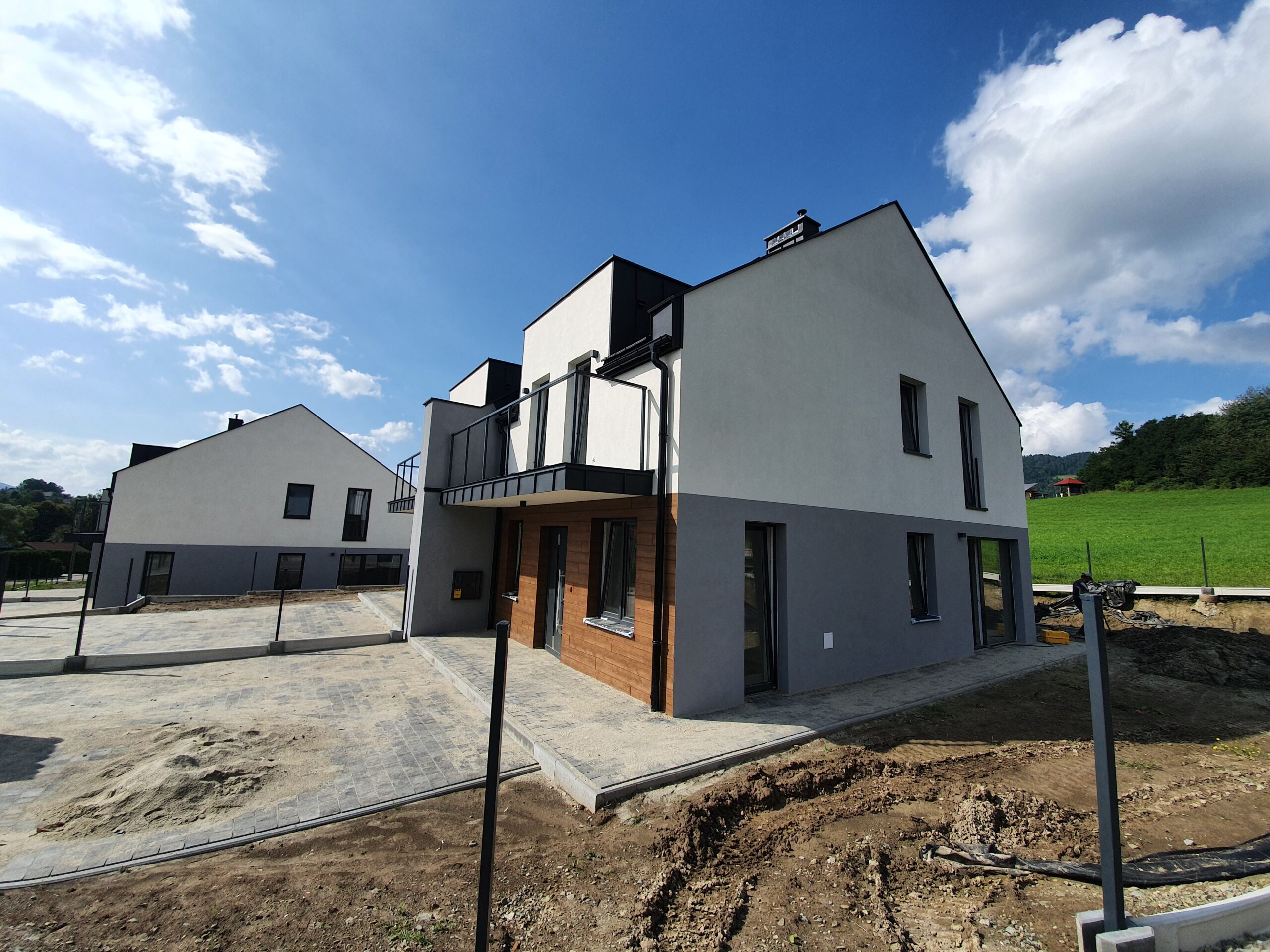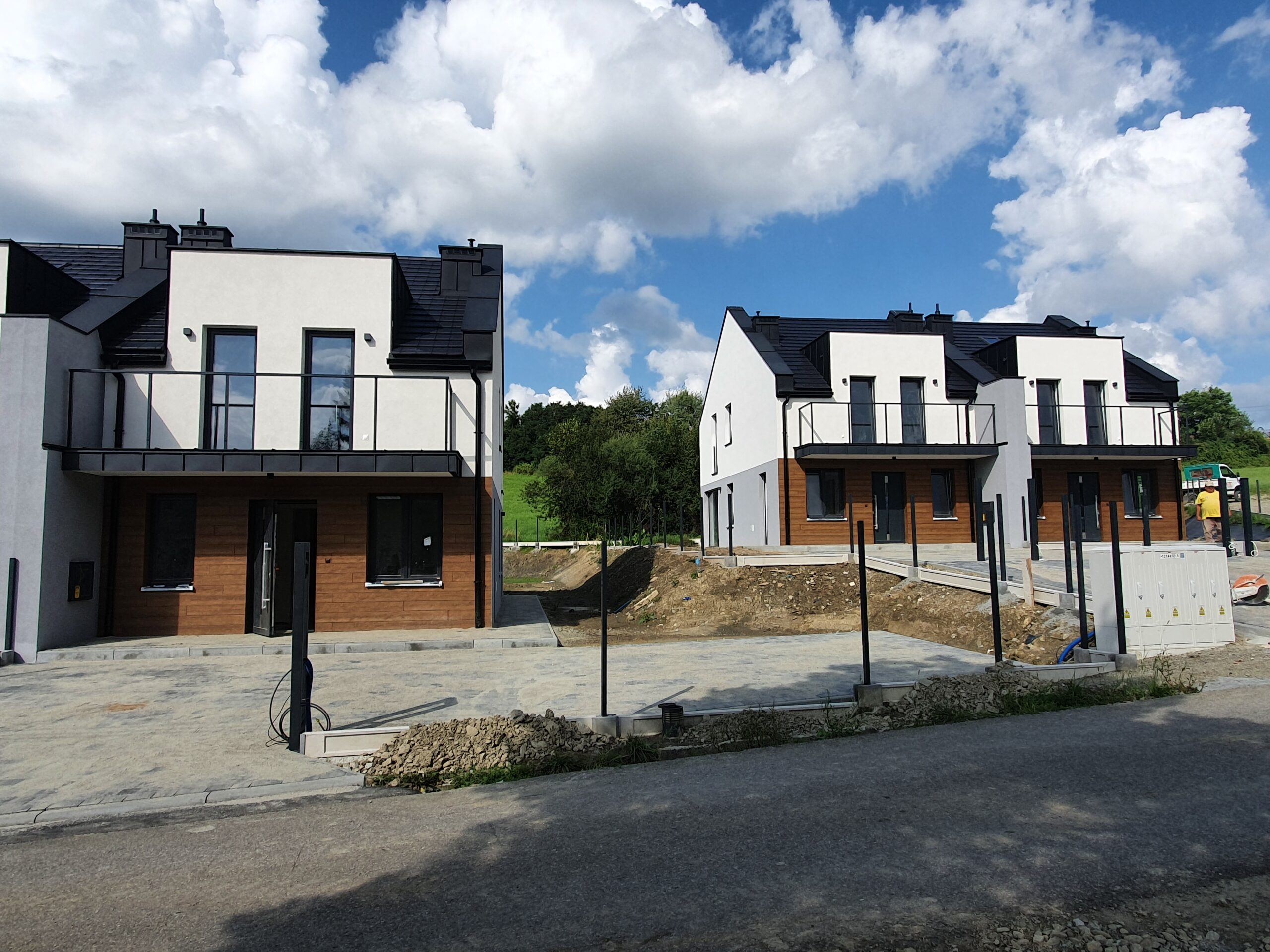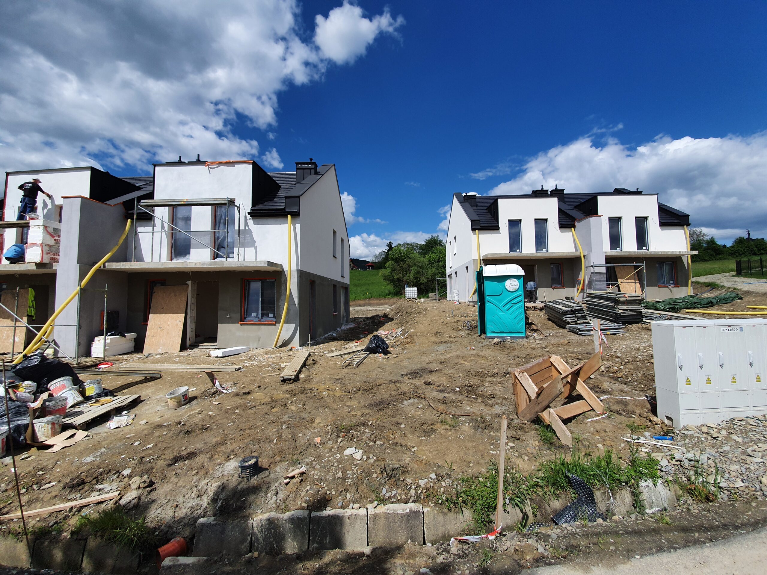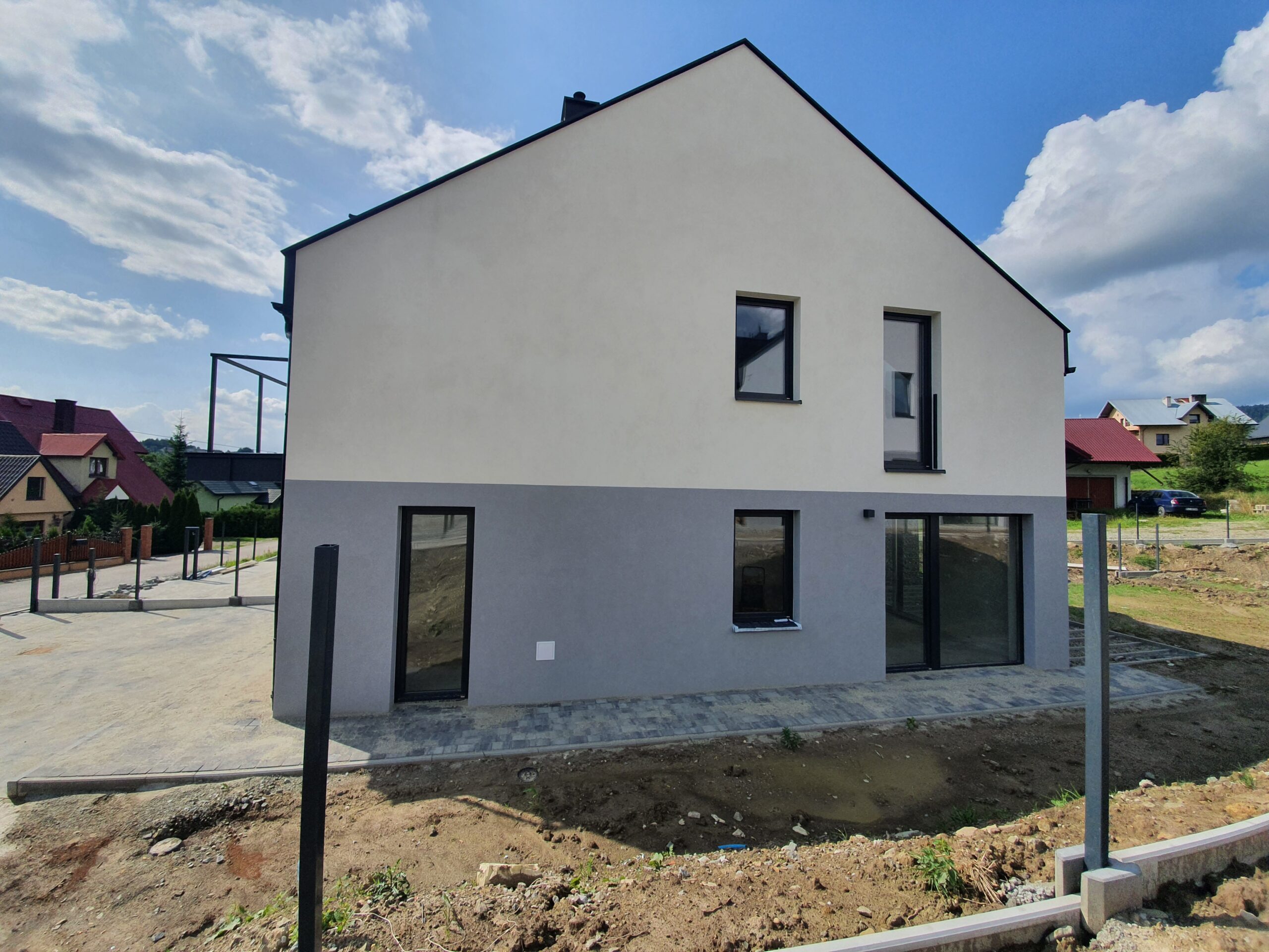 Zakres: Wykonaliśmy elewację 4 budynków jednorodzinnych w zabudowie bliźniaczej.